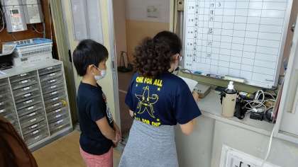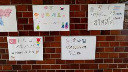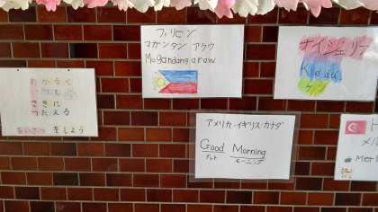 児童会の子どもたちが、いろいろな国のあいさつをポスターに書いて、玄関に掲示しています。また、今週は給食の放送で、世界のあいさつクイズをしました。