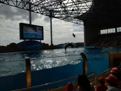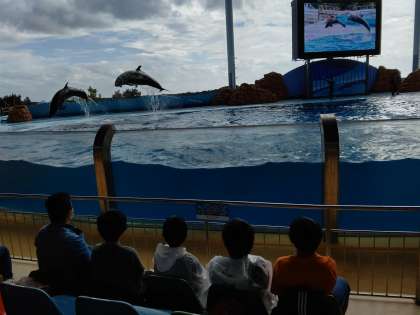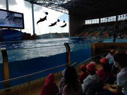 イルカショーのすごいパフォーマンスを見て、感動しています。