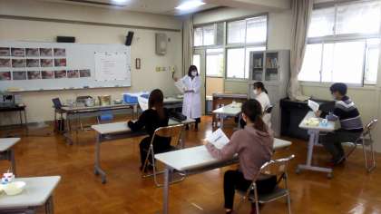 その後、やたなか小中一貫校の栄養教諭、四條先生より献立の説明と学校給食に関しての講話をしていただきました。また、低学年の教室を訪れ、実際に子どもたちが配膳、喫食している様子も見ていただきました。