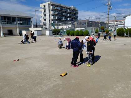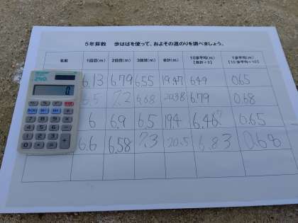 自分の1歩の平均を使って、北運動場や中運動場などいろいろな場所を歩いておよその長さを意欲的に求めていました。