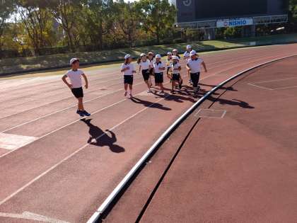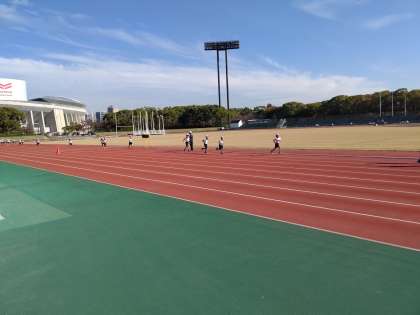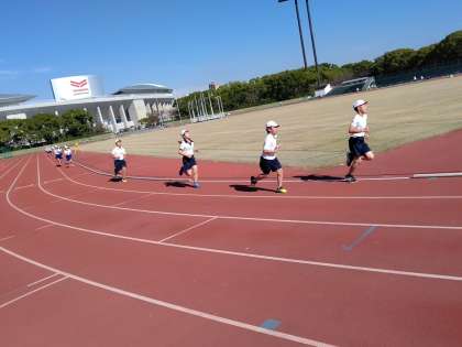 今年度はコロナウィルスの感染防止のため、低・中・高学年で分散して、競技場内のトラックのみを走りました。