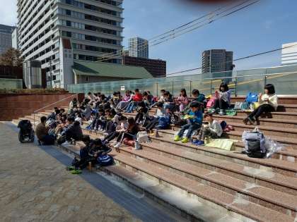 科学館の外で昼食です。前向きで静かに食べていますが、やっぱりお弁当は嬉しい様子です。