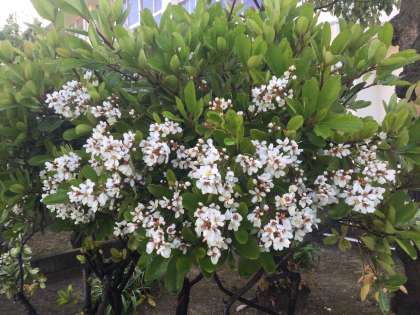 体育館の裏側に植えられているシャリンバイの花が見頃を迎えています。花がウメ(梅)に似ていて、枝先の葉が車輪(しゃりん)のように広がるから、「車輪梅(シャリンバイ)」と名づけられたそうですよ。