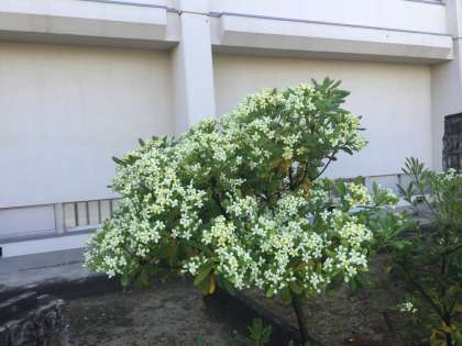体育館の裏側に植えられているトベラの花も見頃を迎えています。トベラを漢字で書くと扉(とびら)。枝葉が独特な香りをしており、節分の時にヒイラギなどと鬼よけとしてトベラを扉(とびら)にはさむ風習があったことから、名前がついたそうですよ。