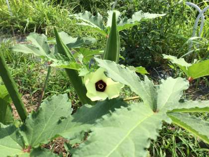 わくわくランドに行くと、オクラが、かわいい花を咲かせまていました。No.39で紹介したムクゲと同じアオイ科で、花はたった1日で終わってしまいます。