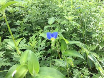 学習園のあちこちで、ミッキーマウスの顔に似た愛らしい花を咲かせています。花は大きな青い2枚と、小さな白い1枚です。おしべのうち、2本は長いです。