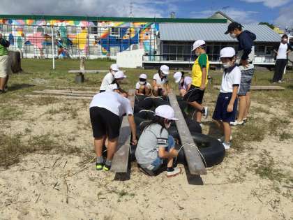板をタイヤにくくりつけると、完成です。