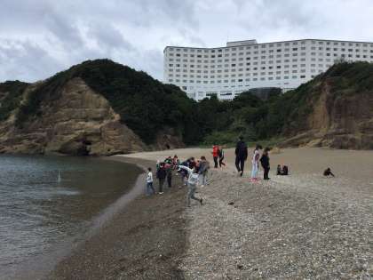 浜辺での活動に入りました。貝を拾ったり、石切りをして、楽しんでいます。
