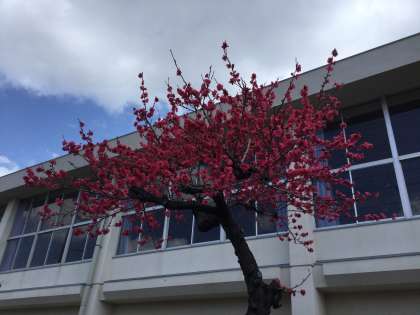 体育館西側のモモが満開になりました。とてもきれいですよ。