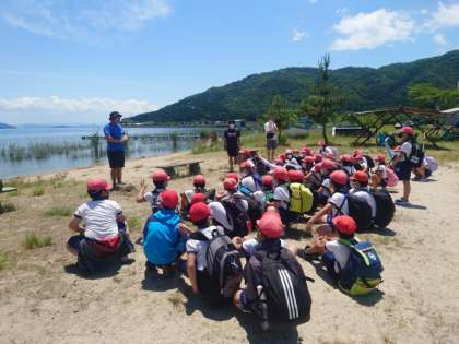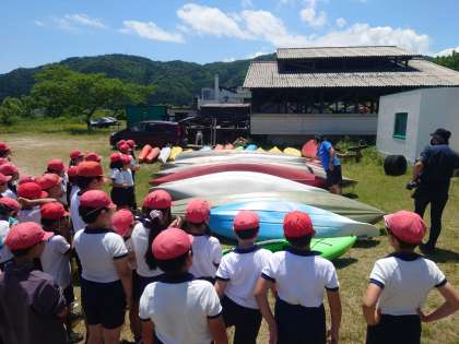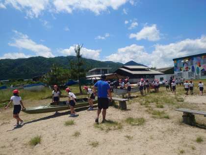 いよいよカヌー・カヤック体験です。まずはみんなで協力して艇を浜辺まで運びます。