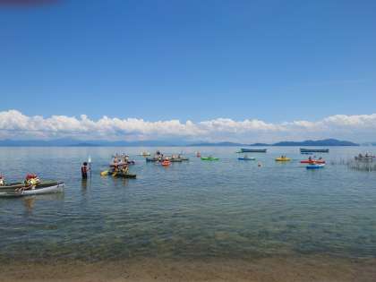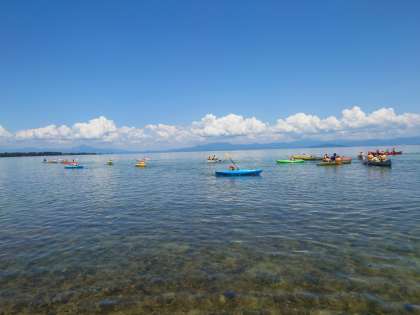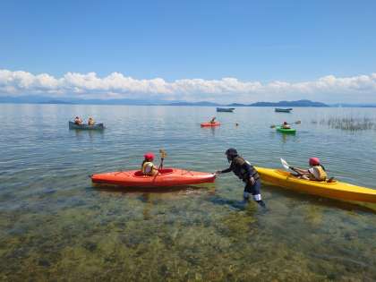 いよいよ湖面へ。まずは練習をしてその後、みんなでびわ湖探検へ。