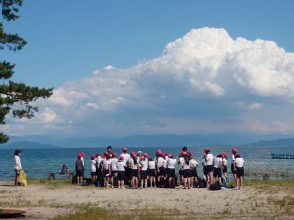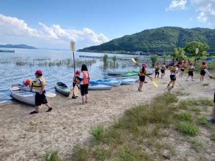 カヌー・カヤック体験終了。最後まで協力して片付けをがんばっています。率先して何度も艇を運ぶ児童もいました。この後、着替えをして、部屋割りです。