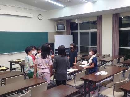 1日の最後、生活班の室長による室長会議です。良かったことや今日の反省点を振り返り、明日の活動につなげます。自分たちでもしっかり反省点が出せていました。失敗もありますが、一つひとつの振り返りを個人でも大切にしてほしいです。