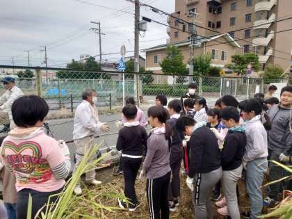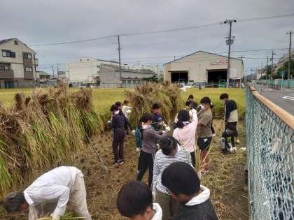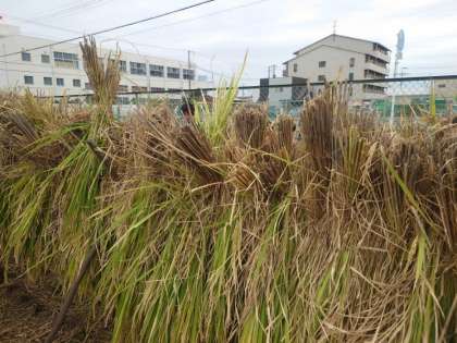 刈り取った稲を束ねて、干します。こぼれ落ちた稲も無駄のないように、最後までしっかり探して束ねます。