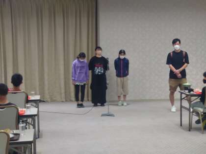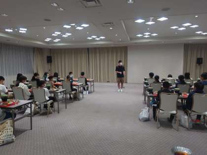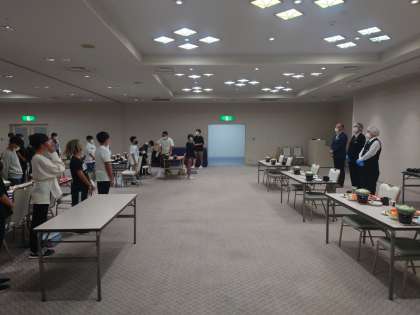 お土産の下見をした後ホールに移動し、待ちに待った夕食です。食事の前にまずは入館式を行いました。2日間お世話になるホテルの皆さんにあいさつです。