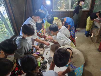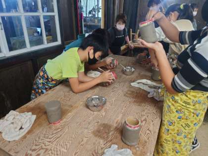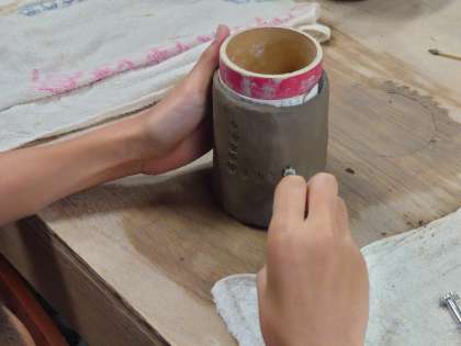 底をつけて、接着面の粘土をしっかり伸ばしたら、ヘラやスタンプで思い思いに模樣や絵柄をつけていきます。