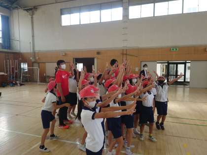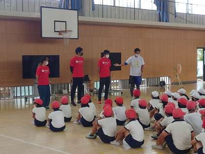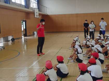 本日、3・4年生は、陸上オリンピックメダリスト朝原さん、同じく陸上オリンピアン荻田さん、ダンサーのアクネナルさん、を迎えて、陸上の特別授業を行いました。ダンスとコラボレーションをした、足が早くなるという体験プラグラムです。まずは、朝原選手の紹介やお話を聞き、休憩時間には選手と子どもたちが直接触れ合いました。