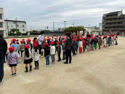 週はじめの朝は少しひんやりとしています。児童朝会で校長先生からはあいさつのお話などがありました。朝会後は低学年の児童たちがその場に残って対面し、あさがおの種を入れた手づくりの大きなメダルを2年生が1年生にかけてあげていました。