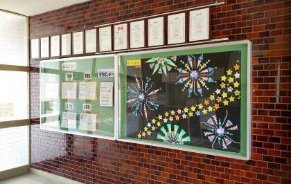 月ごとに入れ替わる玄関の掲示物。今月は、5年生の共同制作『想いを 乗せて』のタイトルで、一人ひとりが小さな星に願いを書いてます。