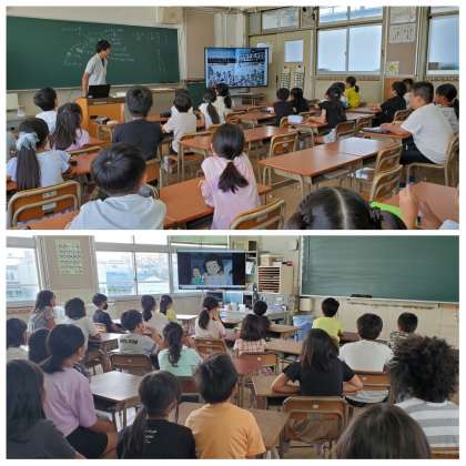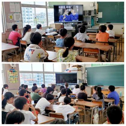 今朝は全校での放送集会に続き、1校時は、各学年ごとで内容の異なるビデオ鑑賞がありました。さらに2校時は、矢田7校の児童生徒で共同制作した「すみれ島」の鑑賞をし、平和について考える機会となりました。