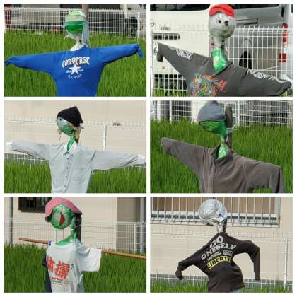 5年生が6月に地域の方々の指導を受け、植えた稲が実りだしてきました。この時期に合わせ夏休み前に手作りしていたかかし6体が立てられました。それぞれのかかしには、紹介するプロフィールも掲示されてます。