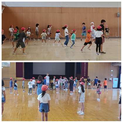 今朝は雲がひろがり、少しはしのぎやすく感じます。2学期はじめての児童集会では、運動場や体育館・講堂に分かれて6年生がリードし、たてわり班で楽しい時間を過ごしていました。