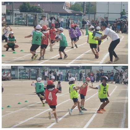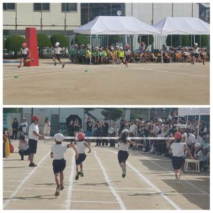 プログラムは、紅白対抗の得点種目に入りました。3年生は「速攻」、4年生は「リレー〜心をつないで〜」、1年生は「ゴールをめざして」でした。懸命に走りぬく姿に、児童席からも大きな声援があがってました。