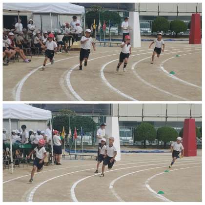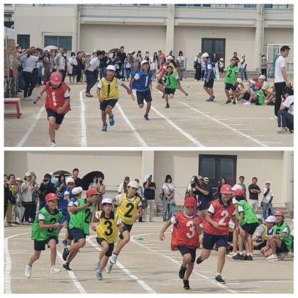 続いて紅白対抗のプログラムは、2年生「カーブにちょうせん」、5年生「想いをたくすバトンリレー」、6年生「バトンにたくして」でした。下級生の児童たちは、上級生のスピードに大きな拍手を送っていました。