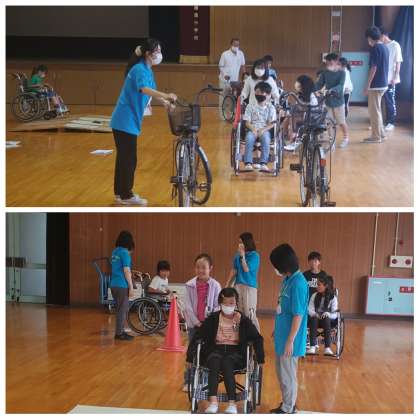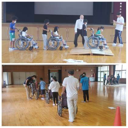 4年生の児童たちは、東住吉区社会福祉協議会の方々のご指導ご協力をいただき「車いす体験」を行いました。二人一組で段差やスロープの上り下り、障害物を避け安全に車いすを押していく操作などを体験しました。