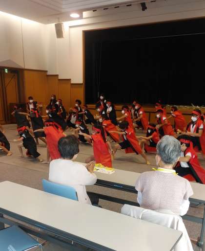 4年生が地域の方々と敬老交流会を行いました。運動会の団体演技「YOSAKOIソーラン」を披露した後、けん玉やお手玉、おはじきなどの昔遊びをしました。