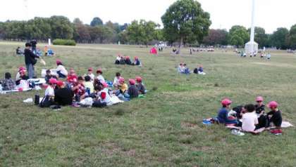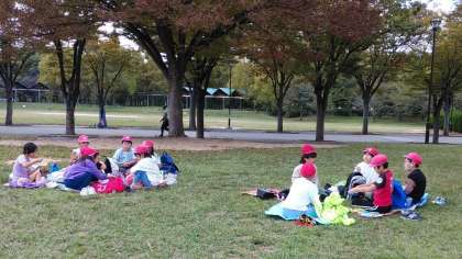 広い芝生広場でお弁当タイムを楽しんでいます。