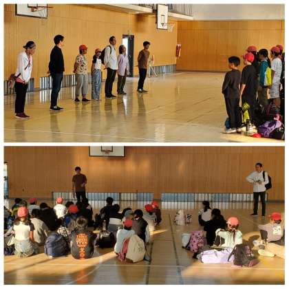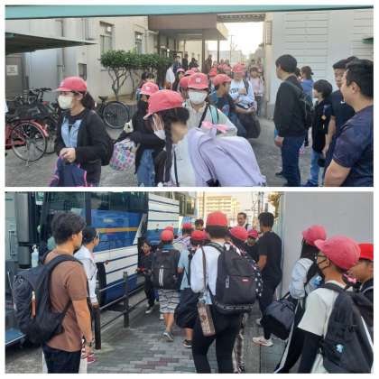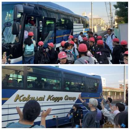 日ざしが届く良い天気になりました。6年生は、今日から2日間の行程で修学旅行です。出発式では、代表児童のあいさつや校長先生の話、引率の先生方の紹介があり、多くの見送りのなか白浜方面に向かいました。