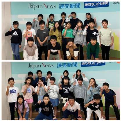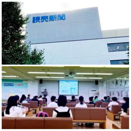 NHK大阪放送局の次に向かったのは、読売新聞大阪本社でした。記者による取材から各家庭への配達までの過程を「新聞教室」で学んだあと、2つのグループに分かれて記念写真の撮影をしました。