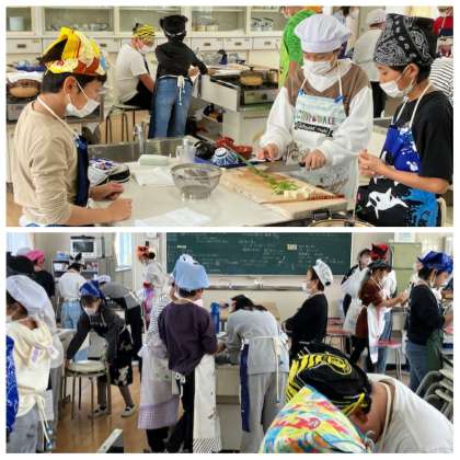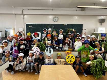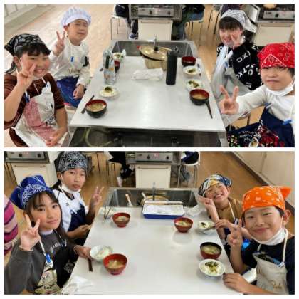 5年生は、地域の方と1学期に田植え、2学期に稲刈り体験をさせていただいた田んぼの新米を焚き上げると同時に、みそ汁の具材には地域からいただいた田辺大根も入れ、「収穫祭」と名づけた調理実習をしました。
