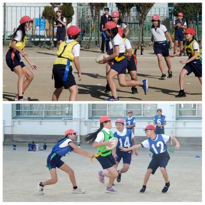 6年生4校時の体育は、6チームが2コートに分かれて互いに対戦し合うタグラグビーの試合でした。放課後にクラブ活動で親しんでいる児童も多く、試合待機チームからのセルフジャジも的確な声がかかってました。