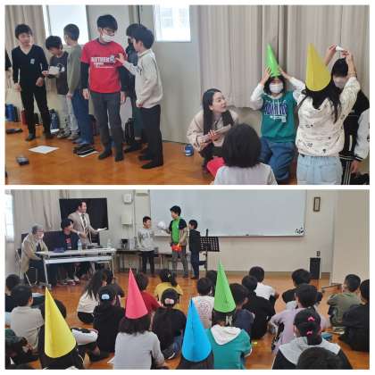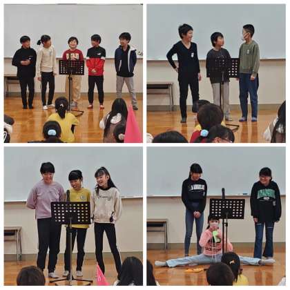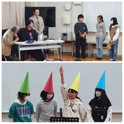 5年生は、吉本興業の漫才師やスタッフの方々に来校いただき、漫才ワークショップをしました。児童たちは漫才グループを組み、各自が考えた台本で笑いを提供し、審査員席の方々からお褒めの言葉をもらいました。