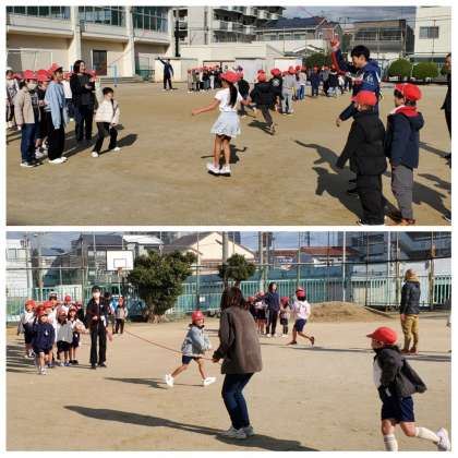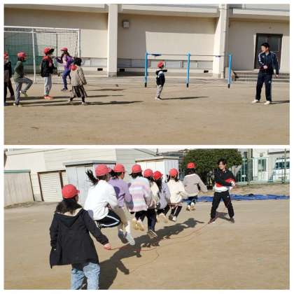 今日の20分休憩のなわとび集会は、おだやかな日ざしが届くもとで長なわを使って行いました。学年・クラスごとに分かれて先生も一緒に入って声をかけ合ったり、回数を数え合ったりしながら協力してできました。
