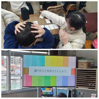 4年生国語の授業の始まりは、親しみ深い百人一首。そして本題は、報告や発表方法についてでした。どのようなことを調べ、聞き手に分かりやすく伝えるには、どうすればよいかを互いに意見を出し合い考えました。