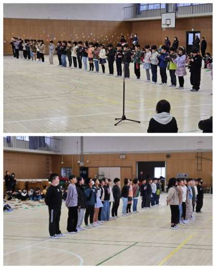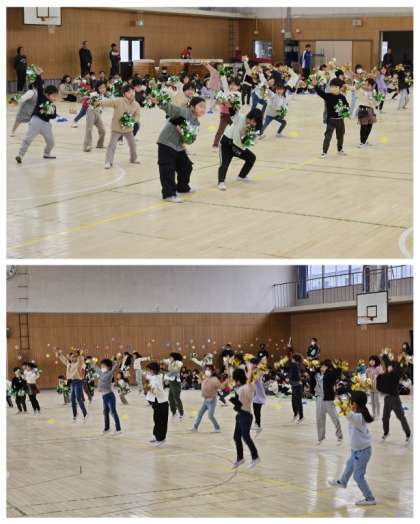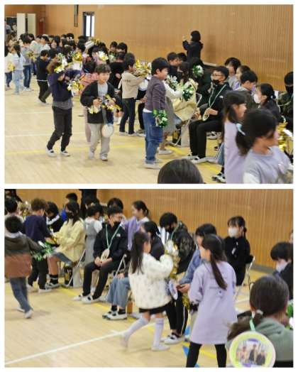 続いて3年生からも、リコーダー演奏や歌のプレゼント。1年生は、リズムにのったダンスを見せてくれました。また、1年間たてわり班でお世話になったお兄さんお姉さんに対して、大きなメダルがかけられました。
