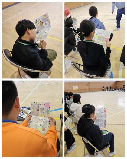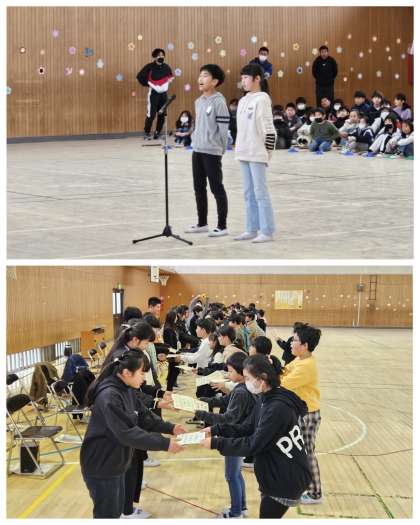 在校生代表から卒業生に対して、お祝いの言葉と下級生に優しく接してくれたお礼、在校生の決意が力強く述べられました。その後、5年生から卒業生一人ひとりにたてわり班全員のメッセージカードが贈られました。