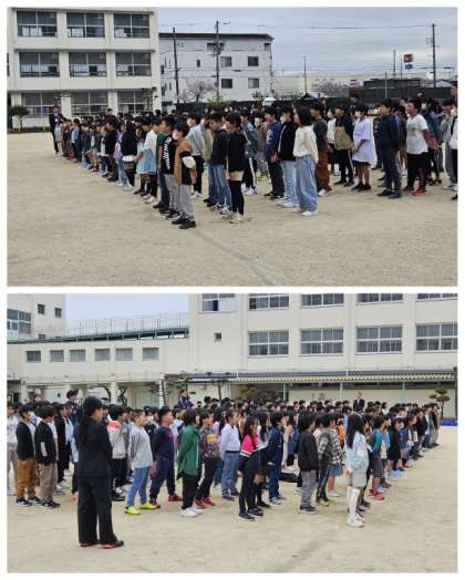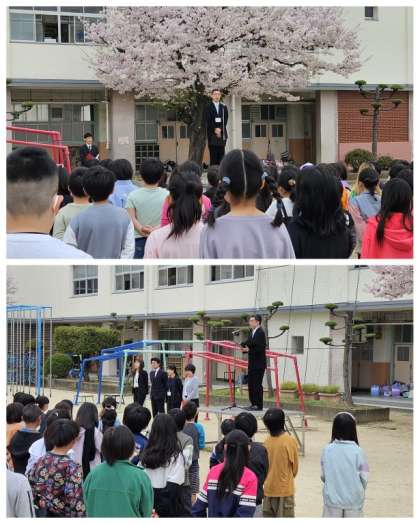 全校児童が登校し、中運動場で着任式・始業式が行われました。新しく赴任した教職員の紹介に対して、児童たちは「よろしくお願いします!」と元気な声で歓迎のあいさつをしていました。その後、担当する教職員の発表や学校生活の諸注意があり、最後に大きな声で校歌を斉唱しました。