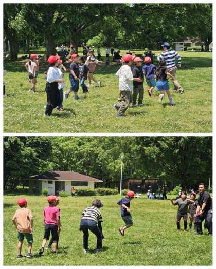 楽しみにしていたお弁当タイムです。食後のおやつも美味しそうです。しばらく緑に囲まれた大芝生広場で、のびのびと遊んでいました。