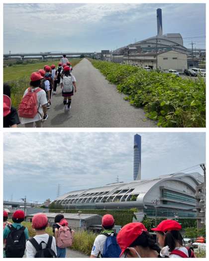 4年生は午前中、徒歩で平野焼却工場へ見学に行きました。途中で休憩をし、大和川沿いに進むと工場の大きな建物が次第に近づいてきました。