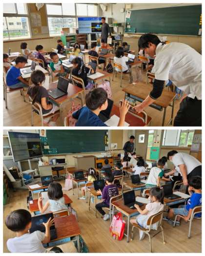 1年生は、タブレットを保管庫からとり出し、個人のアカウントからログインし、ログアウトすることを試しました。今後、練習を重ねて6月の土曜授業後には、家庭に持ち帰りオンライン接続テストもする予定です。