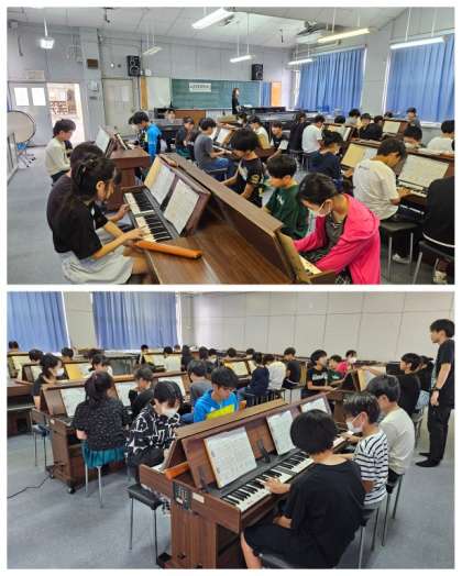 6年生音楽の授業では、クラスで合奏練習をしています。曲は「ラバーズコンチェルト」。主旋律を全員がリコーダーで演奏した後、電子オルガンで互いにパートの役割や音色の特徴を生かして合奏練習を行いました。