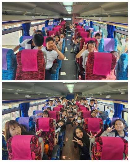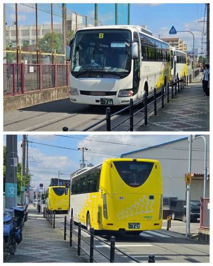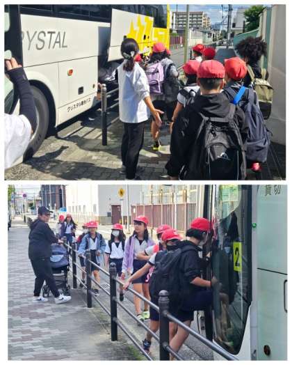 学校前から荷物を積み込みバス乗車完了。それぞれの車内では、はじける笑顔がありました。これからトイレ休憩をはさみ琵琶湖に向かいます。