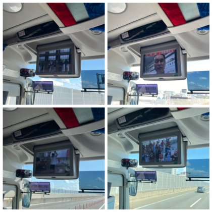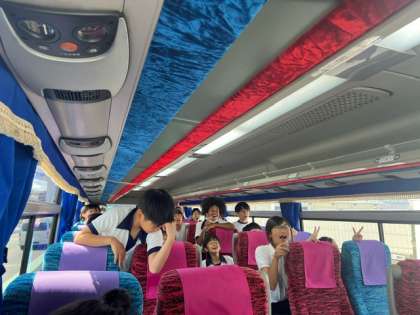 バスの中では、6年生や先生方からのメッセージビデオを見ています。幼いころの自分たちの映像も出てきて大盛り上がりです!