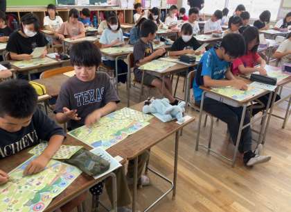 6年生は、東住吉納税協会の方を講師に招いて租税教室を行いました。最初は、アニメ動画でわかりやすく税について学び、最後は「町をつくろう!」シートに町づくりシールを貼り、くらしと税について考えました。