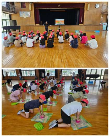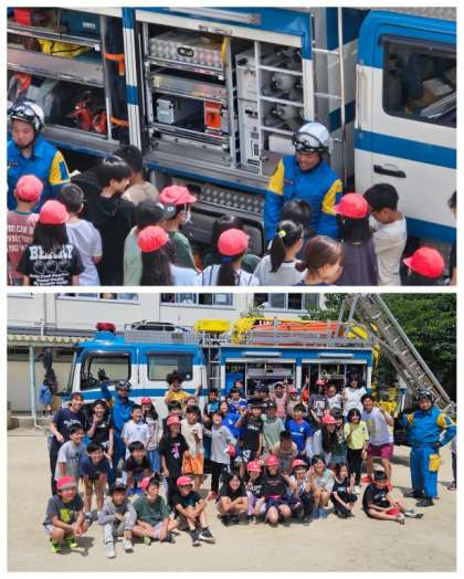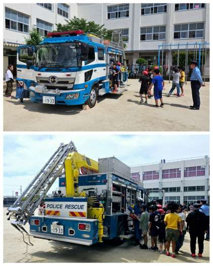 5・6年生は、講堂で消防署の方から心肺蘇生トレーニングキットを使った胸骨圧迫講習を受けました。中運動場では、大阪府警察の災害救助車の見学もさせてもらいました。保護者の皆様方におかれましては、参観に続き児童の引き渡し訓練にもご協力いただきありがとうございました。