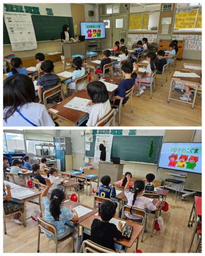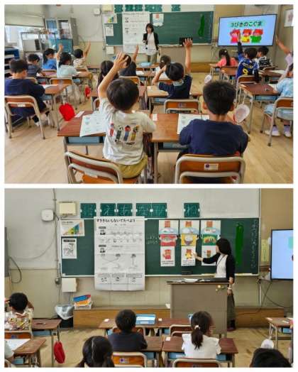 1年生各クラスでは、栄養教諭の講師から「からだをつくるたべもの」「エネルギーのもとになるたべもの」「からだのちょうしをととのえるたべもの」について、3びきのこぐまのかみしばいや質問紙で学びました。